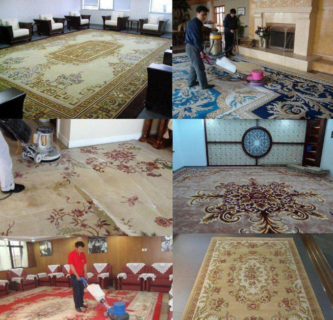 羊毛地毯清洗程序: 1 吸尘 用吸尘器对地毯进行全面吸尘处理。 2 局部处理 用专用清洁剂对地毯上的油渍、果渍、茶渍、咖啡渍等单独进行处理。 3 干泡刷洗 用装有打泡器的地毯干洗机以干泡对地毯清洗。 4 吸污 等地毯毛完全干透后,再用吸尘器吸去污垢和干泡结晶体。